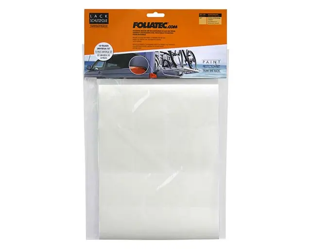 Foliatec beskyttelsesfilm er et gjennomsiktig og slitesterkt PVC-sett som beskytter bilens lakk mot riper og skader forårsaket av bakmontert sykkelstativ. Filmen kan også festes direkte på sykkelstativet for å redusere slitasje under transport og oppbevaring. Settet inneholder 10 selvklebende deler i ulike størrelser, tilpasset forskjellige overflater.